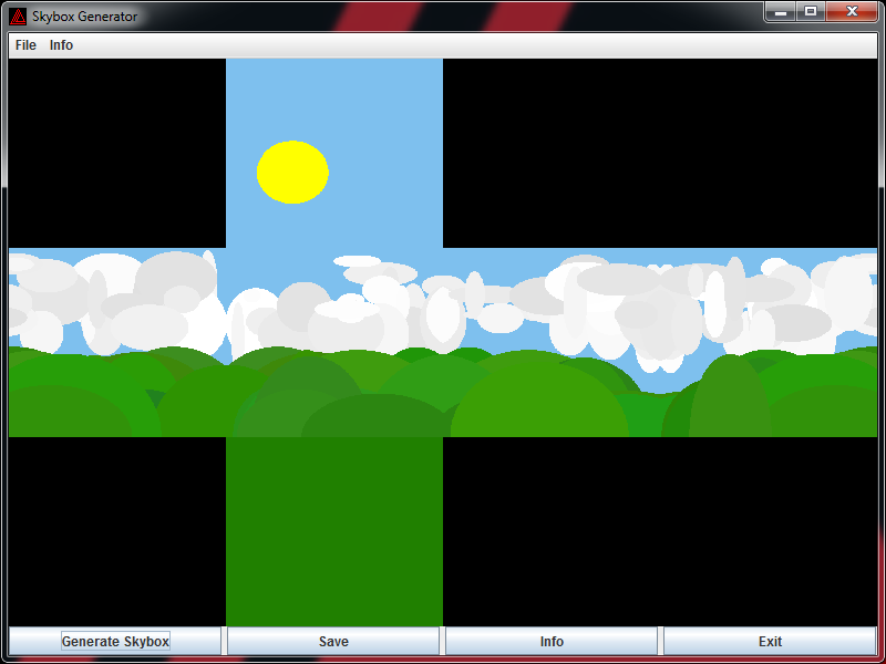 Java application for generating skyboxes for 3D games. This tool allows you to create 512x512 skybox cartoonish style textures in PNG image format. Sky, sun, clouds, hills and ground can be generated with a single click.